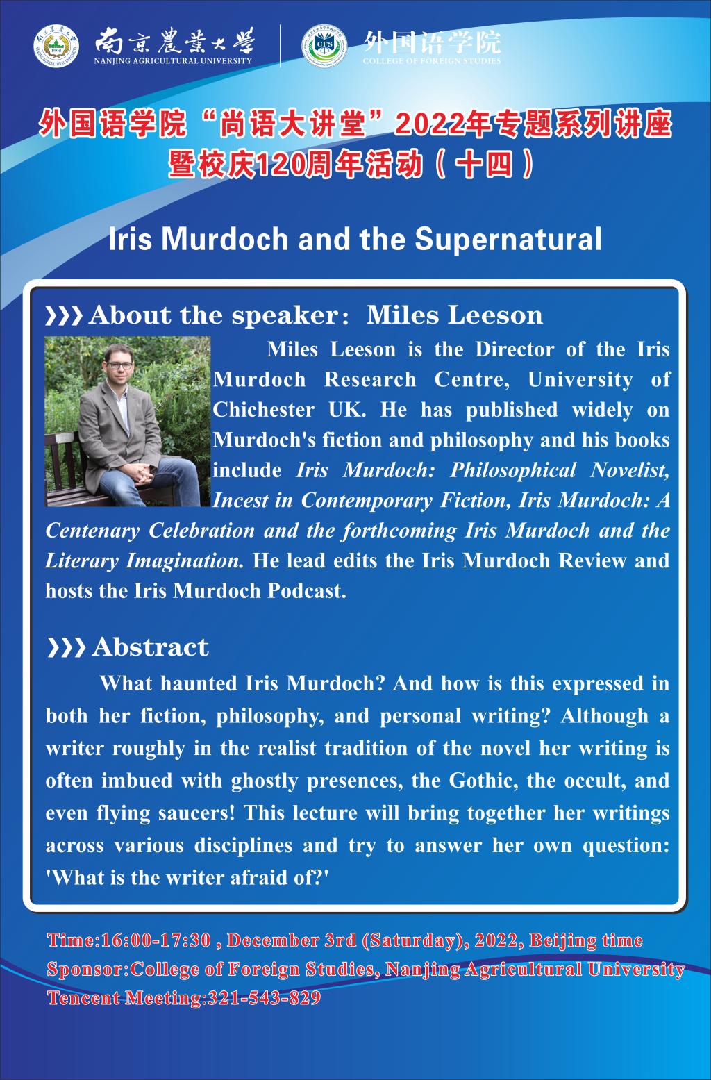 讲座题目:爱丽丝·默克多及其作品中的超自然现象分析(Iris Murdoch and the Supernatural)