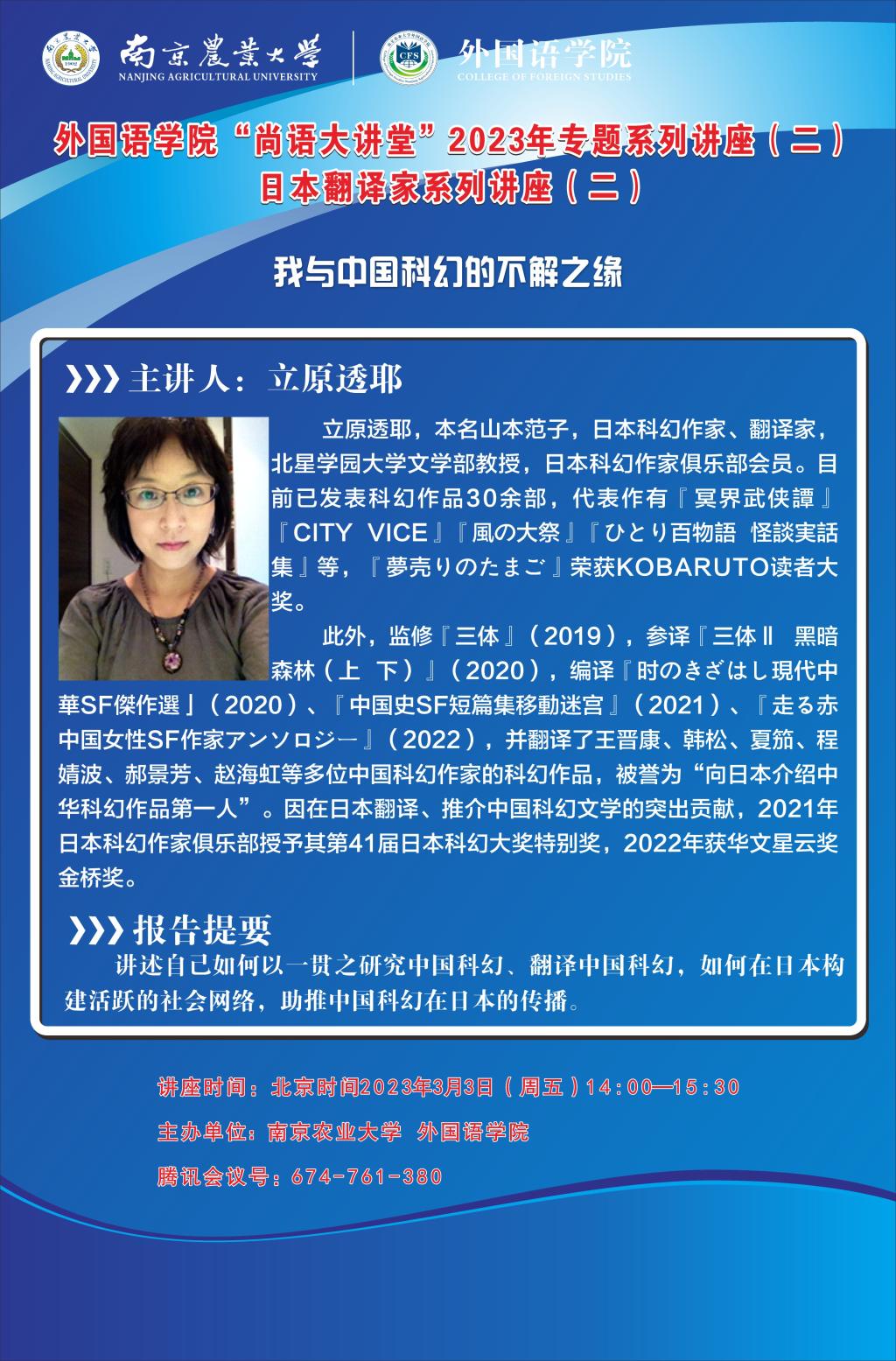 下一篇:“尚语大讲堂”2023年专题系列讲座(一) 日本翻译家系列讲座(一):从翻译感悟中国SF的魅力