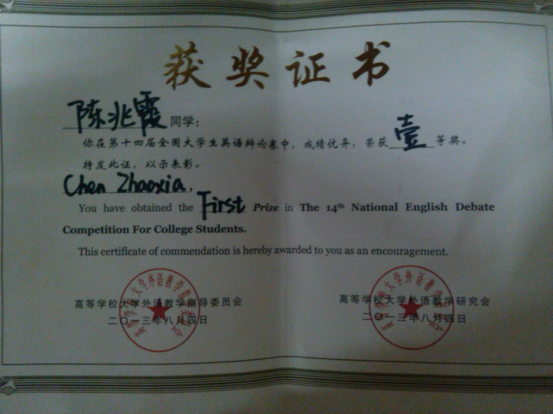 2013年7月31日到8月4日,第十四届全国大学生英语竞赛(National English Contest for College Students,简称NECCS)全国总决赛暨全国大学生英语夏令营在吉林省长春市举行。我校mg冰球突破试玩陈兆霞同学在此次活动中以第一名的成绩荣获第十四届全国大学生英语演讲比赛一等奖,并获得第十四届全国大学生英语辩论赛一等奖。