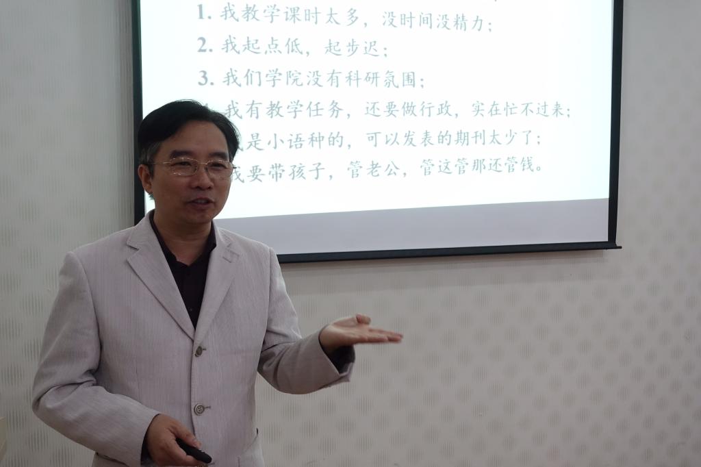 毛浩然教授的讲座主要围绕如何做以及如何做好科研而展开。毛浩然教授首先分析了高校师生做不好科研的原因,接着从四个方面介绍如何提高科研能力。第一、坚持项目驱动,即在跨学科研究中,坚持主旋律。同时,他还分享了独创的科研“五步走”方法,帮助师生在短时间内提高对不同学科基础和前沿研究的了解。第二、坚持问题导向。他指出,所有论文都必须是提出问题、分析问题和解决问题的过程。一篇论文只能解决一个具体的小问题,以小见大,说通说透。第三、话题点穴。他认为论文标题要深入浅出,要能让期刊评委直接看出论文的研究问题。如何写好标题可适当借用修辞手法。第四、修辞出场。他将未使用修辞手法和使用修辞手法后的论文题目进行对比,展现了修辞手法的重要性。