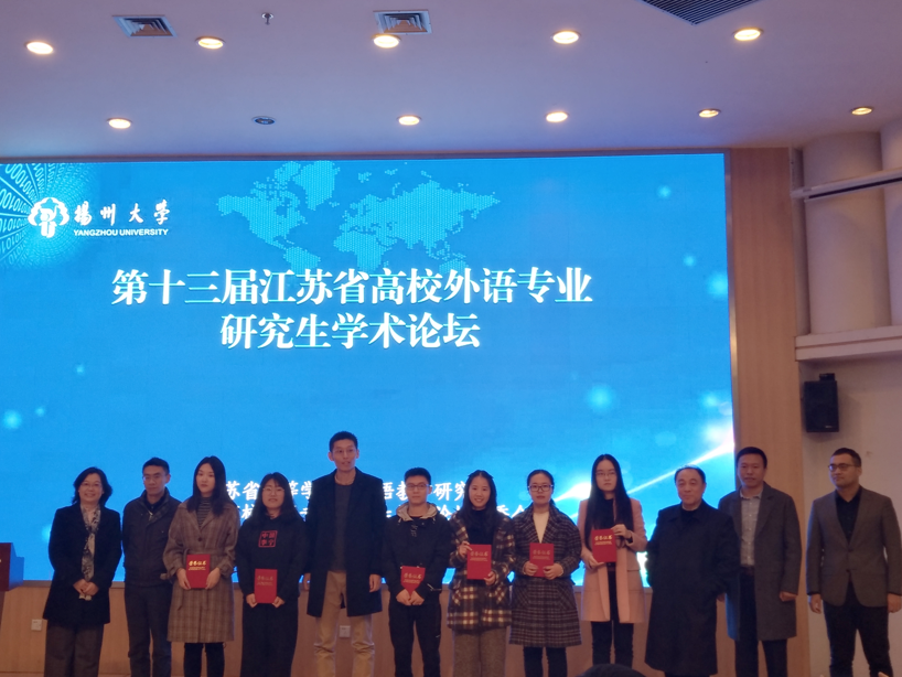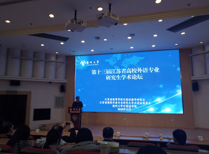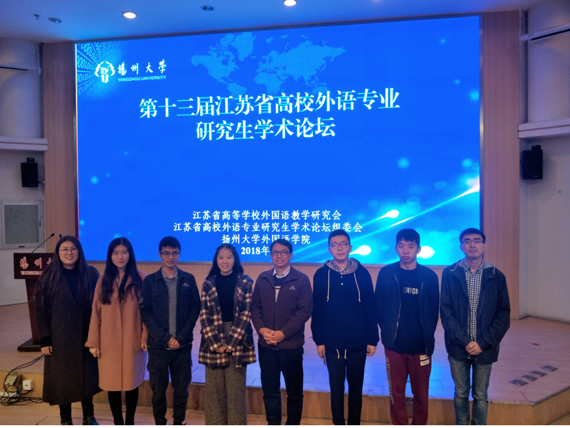 2018年12月1日至2日,第十三届江苏省高校外语专业研究生学术论坛在扬州大学隆重召开。本届论坛由江苏省高等学校外语教学研究会、江苏省高校外语专业研究生学术论坛组委会以及扬州大学mg冰球突破试玩共同主办。冰球官网李平教授携7名外国语言文学和翻译专业的研究生参加了本次论坛。