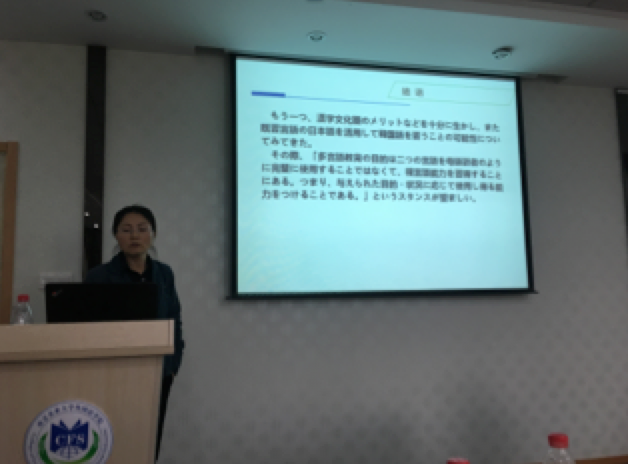 5月6日下午,继田原老师的系列讲座后,mg冰球突破试玩“日语系建设交流报告会”第三次会议在教学楼A310顺利召开。此次报告会特别邀请了田原老师出席,由日语系副教授金锦珠老师以「多言語社会における日本語教育」为题作了报告。报告会由石碧老师主持,学院日语系教师及部分研究生参加。金老师以中国的多语种社会状况为引子,汇报了面临转型的日语现状,探讨了在先进的语言习得理论之下,如何开展日语教育,培养出符合教育部大纲要求的日语人才。金老师的报告,引用了很多实例,生动地反映了日语教育的现状和问题,其中肯的建议对冰球官网师生今后的科研教学工作有重要指导意义。