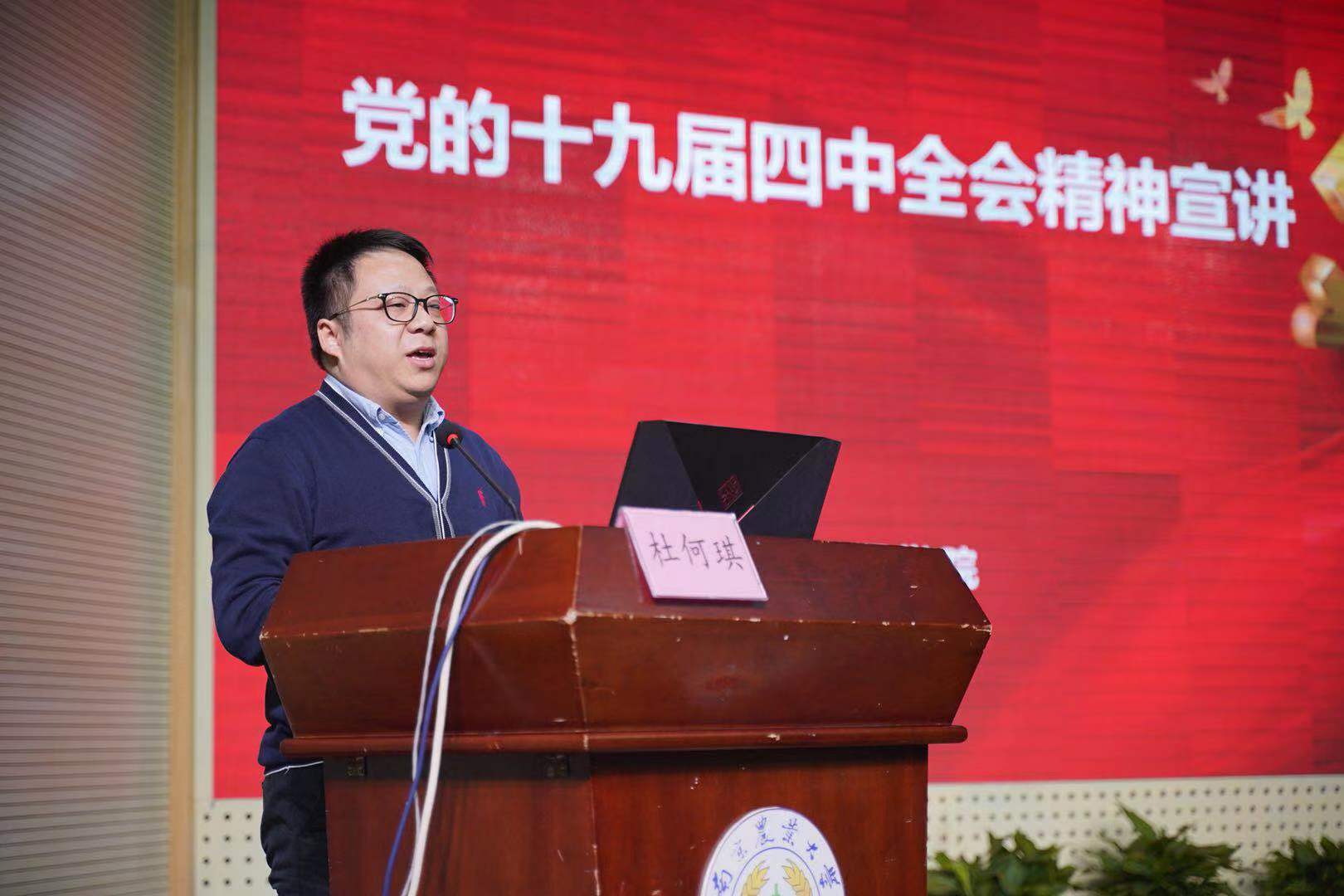 为深入学习宣传贯彻党的十九届四中全会精神,扎实做好学院党的十九届四中全会精神宣讲工作,根据学校统一部署,mg冰球突破试玩于12月14日和23日分别举行了两场党的十九届四中全会精神宣讲报告会。宣讲会由院党委副书记韩立新同志主持。