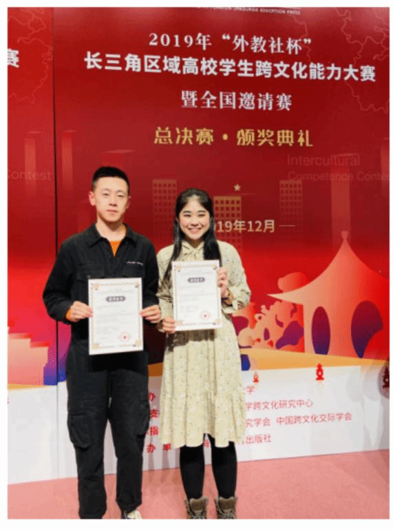 本次大赛共有 200 多所高校参加,选出 17 支队伍赴上海外教社参加总决赛。我校学生黄星凭(BEVERLY NG XINPING)和孙毓琳入选江苏省代表队。通过两天激烈的角逐,两名选手在跨文化案例展示和现场问答环节表现优秀进入总决赛。总决赛分为三个环节,跨文化知识快问快答、情景评述、讲述中国故事,留学生黄星凭(BEVERLY NG XINPING)获得总决赛一等奖和特别贡献奖,孙毓琳同学获得三等奖,两位同学赢得了专家评委们的一致认可;外语学院苏瑜、王婷和徐红芳三位老师获得优秀指导奖。