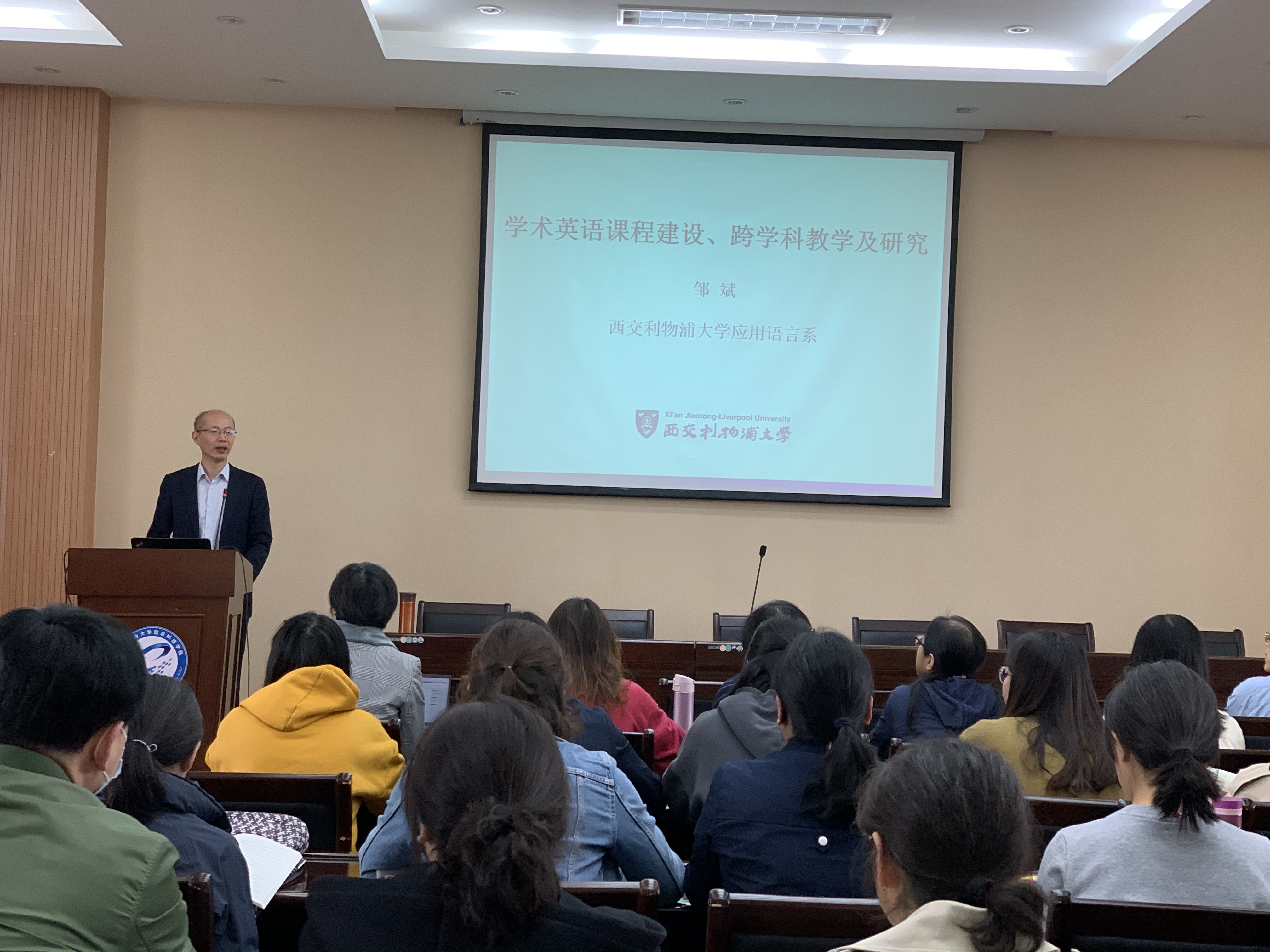 2020年10月26日下午,西交利物浦大学应用语言学系邹斌副教授应学院邀请,在教学楼七楼报告厅,为冰球官网师生做了题为“学术英语课程建设、跨学科教学及研究”的讲座。此次讲座由mg冰球突破试玩英语系教师贾雯主持,mg冰球突破试玩中青年教师和部分研究生参加。