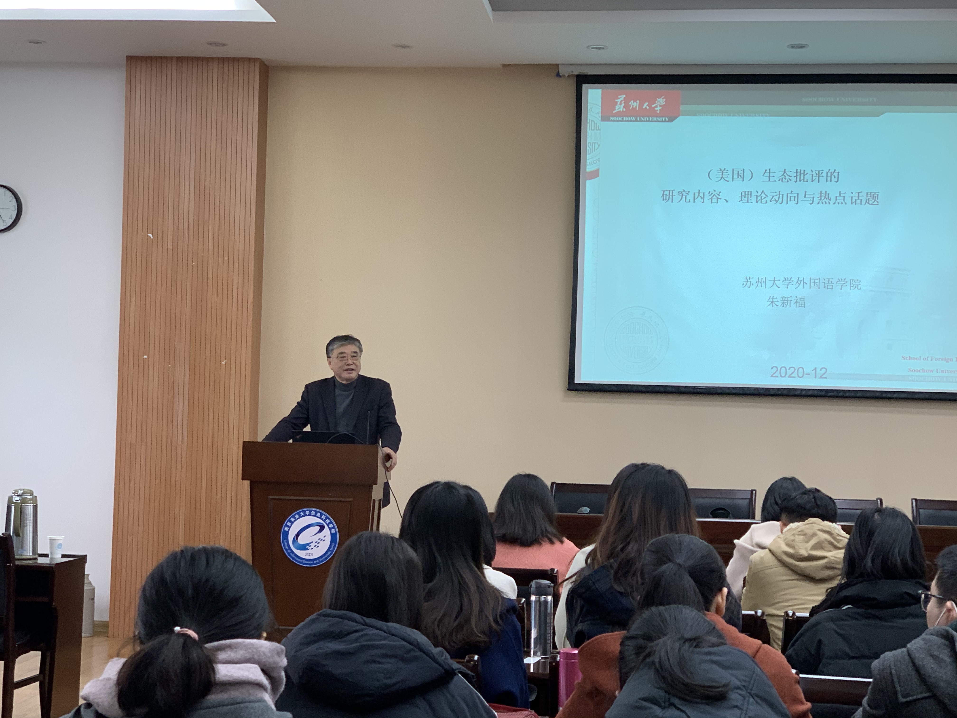 2020年12月7日下午,苏州大学mg冰球突破试玩院长、博士生导师朱新福教授应冰球官网邀请,于教学楼七楼报告厅为冰球官网师生作题为“(美国)生态批评的研究内容,理论动向与热点话题”的学术讲座。本次讲座由mg冰球突破试玩副院长(主持工作)曹新宇主持,部分教师和研究生到场聆听。