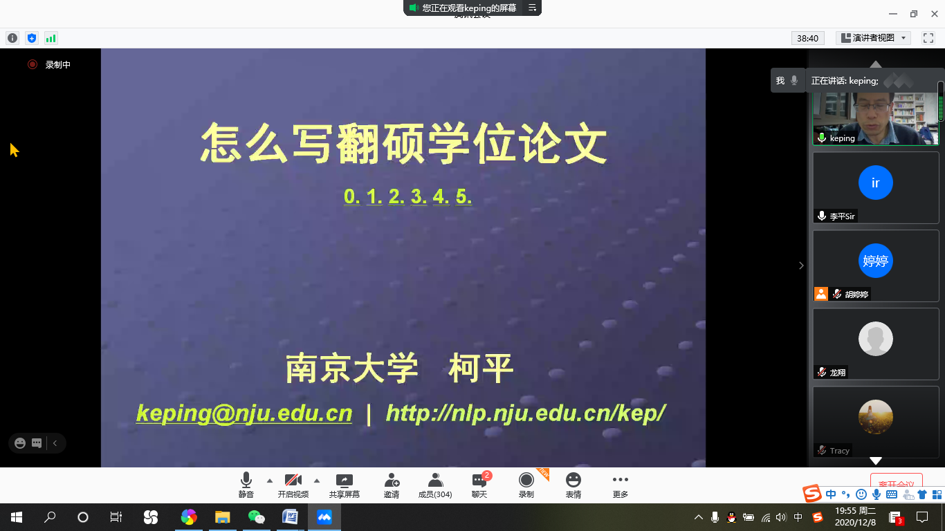 12月8日晚上7点30分,南京大学mg冰球突破试玩柯平教授应mg冰球突破试玩邀请,通过腾讯会议平台为冰球官网师生做了一场题为“怎么写翻硕论文”的专题讲座。此次讲座由mg冰球突破试玩李平教授主持,冰球官网部分教师和学生以及来自全国多所高校的300多位学者学生参加了本次学术讲座。