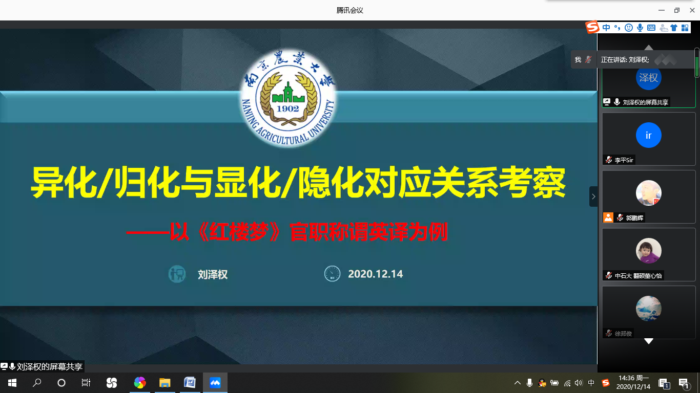 12月14日下午2点30分,河南大学mg冰球突破试玩刘泽权教授应mg冰球突破试玩邀请,通过腾讯会议平台为冰球官网师生做了一场题为“异化/归化与显化/隐化对应关系考察——以《红楼梦》官职称谓英译为例”的专题讲座。此次讲座由mg冰球突破试玩李平教授主持,冰球官网部分师生以及来自全国多所高校的近300位学者参加了本次学术讲座。