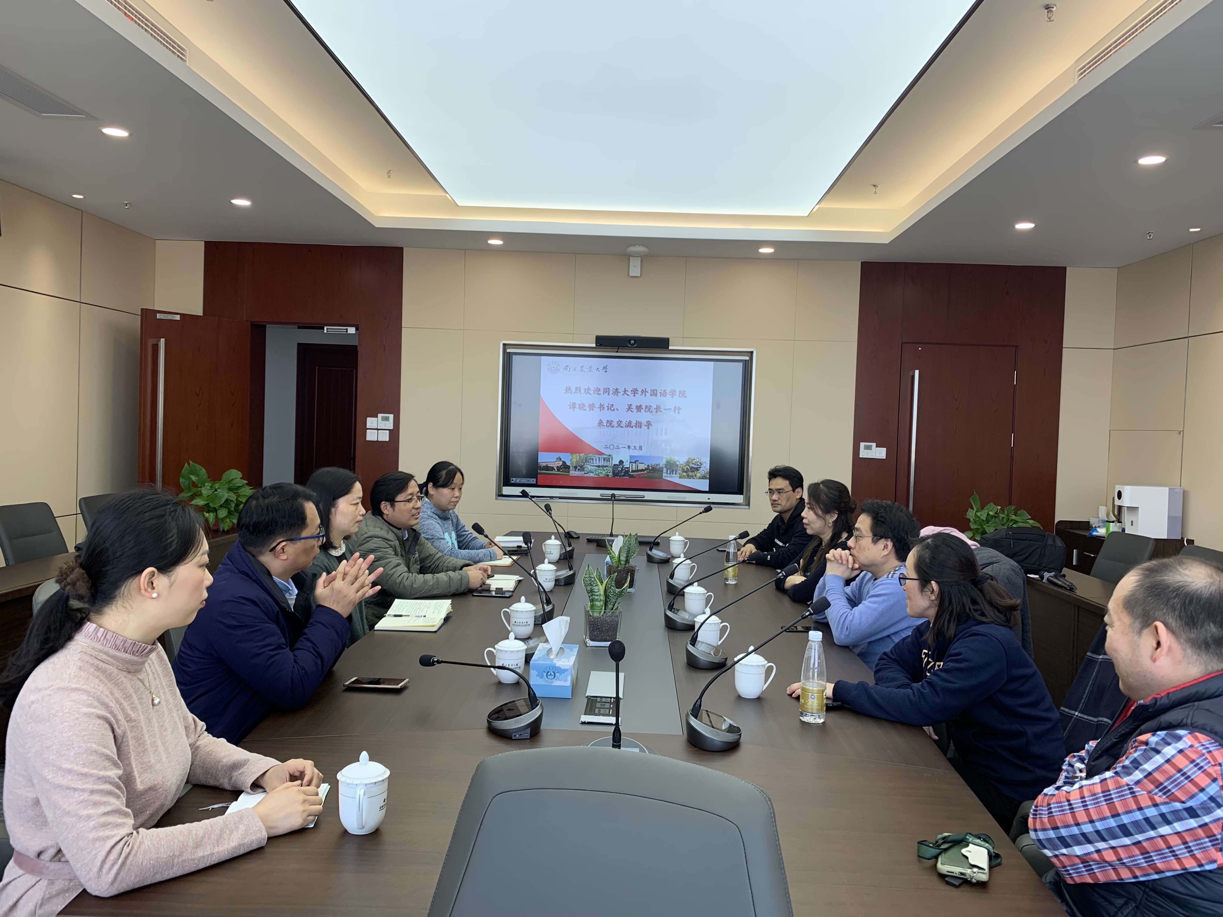 吴赟从发展思路、学科布局、师资建设、课程思政、科研团队建设等方面介绍了同济大学mg冰球突破试玩的发展情况,并就如何以国家战略和社会需求为目标,对标新时代外语学科改革发展新需求,运用系统化思维,突出问题导向和交叉创新,实现教学、科研、实践的一体化发展阐述了自己的理解。谭晓赟就新时代mg冰球突破试玩如何立足自身基础,借力学校优势平台,拓宽科研思路,找准主攻方向,服务学校国际化方面谈了自己的体会。双方老师们也分别就青年教师培养、科研方向凝练、人才培养理念、学院治理模式等方面进行了深入地交流和探讨。