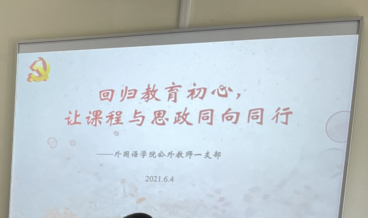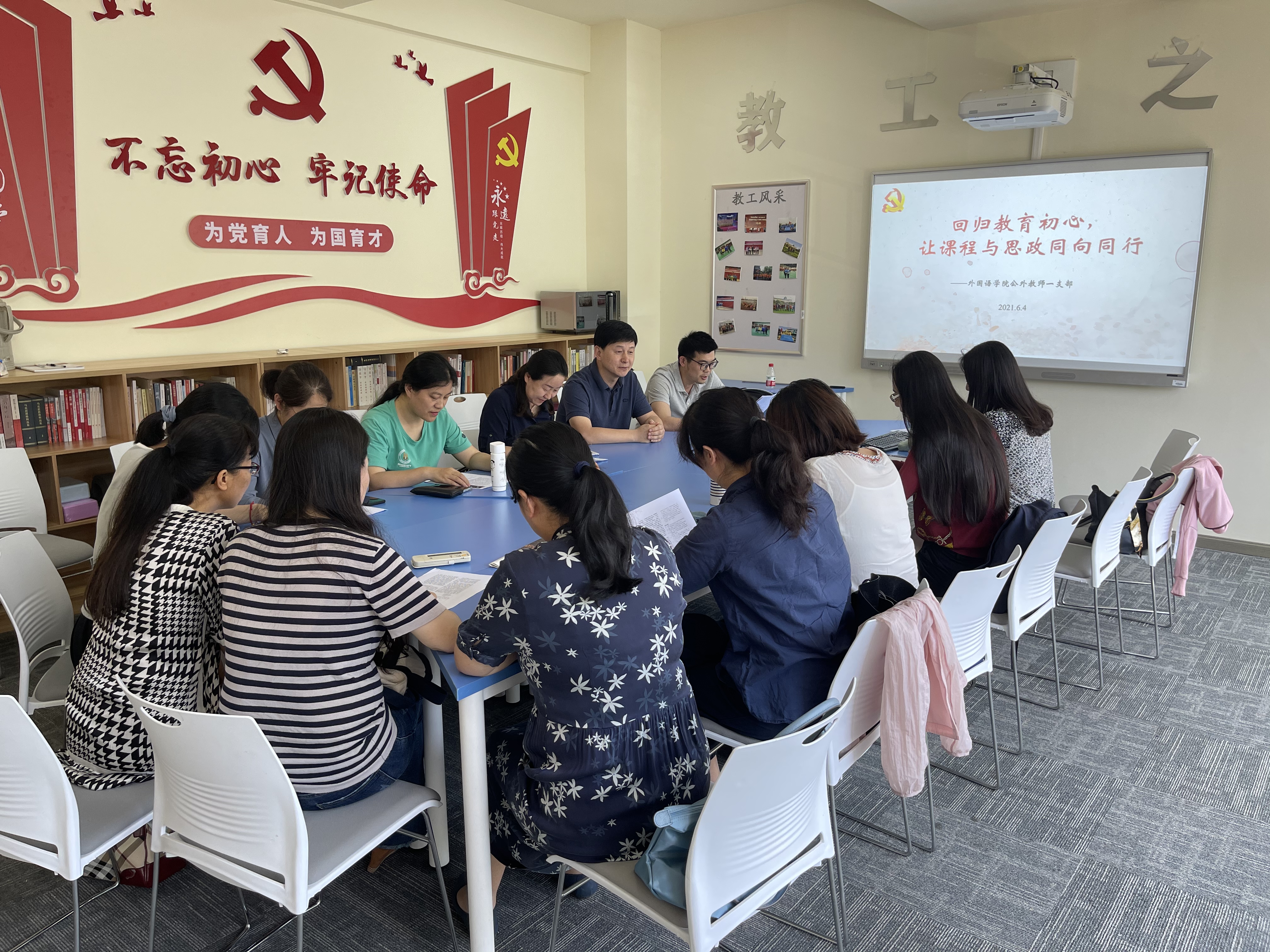 6月4日中午13点40,公外教师第一党支部在党员之家开展了“回归教育初心,让课程与思政同向同行”为主题的支部会议。公外教师第一党支部全体党员参加了此次活动。