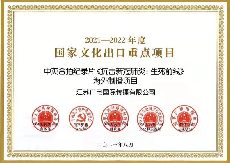 近期,江苏广电国际传播有限公司制作的中英合拍纪录片《抗击新冠肺炎:生死前线》海外制播项目,经商务部、中宣部、财政部、文化和旅游部、广电总局五部委联合评选认定,正式入选2021-2022年度国家文化出口重点项目。冰球官网王银泉教授为《抗击新冠肺炎:生死前线》提供解说词的翻译和审定。