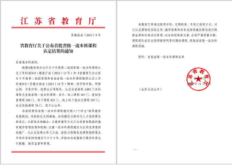 近日,江苏省教育厅印发《关于公布首批省级一流本科课程认定结果的通知》(苏教高函〔2021〕9号),冰球官网孔繁霞教授团队课程《工科英语》入选首批省级一流课程。