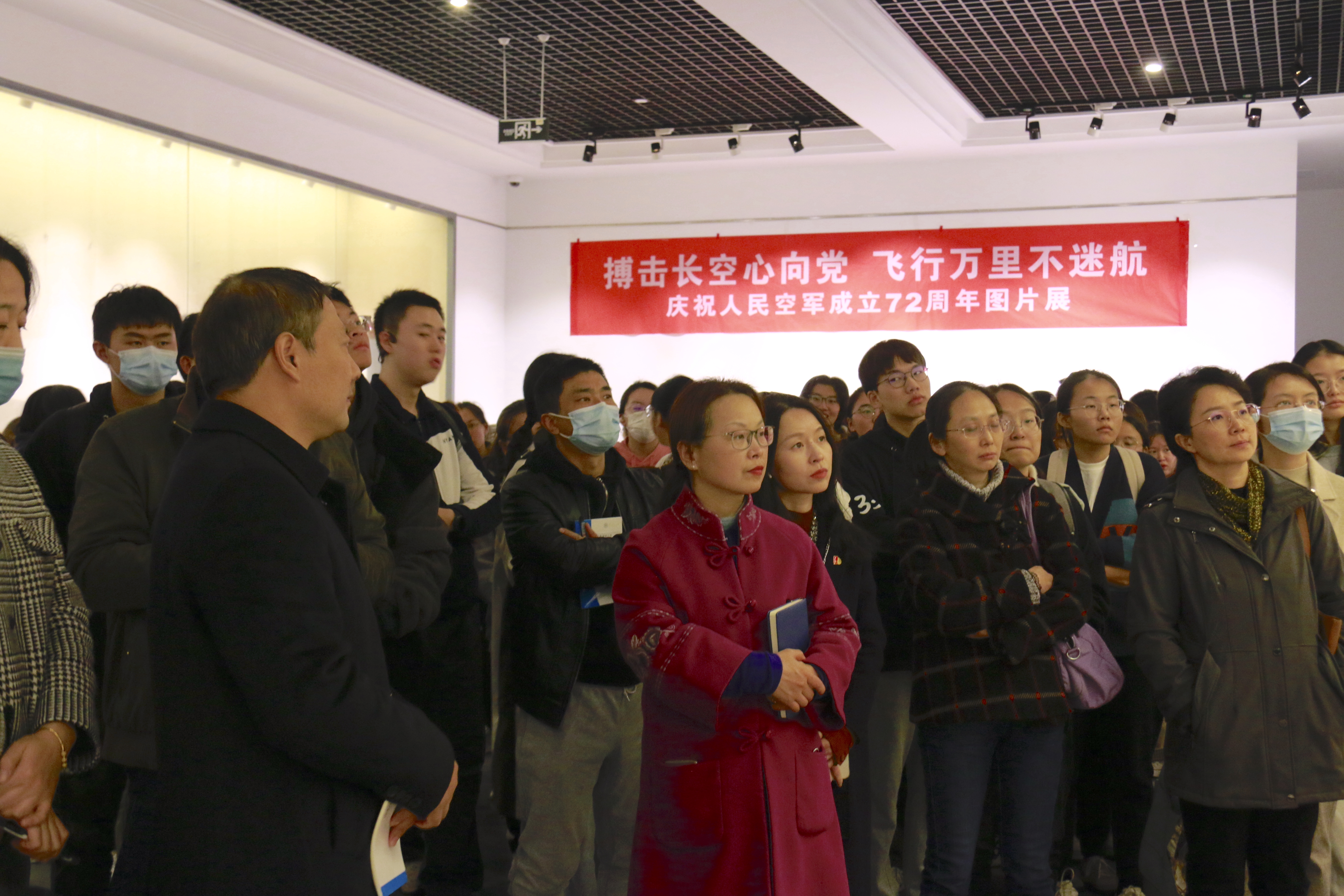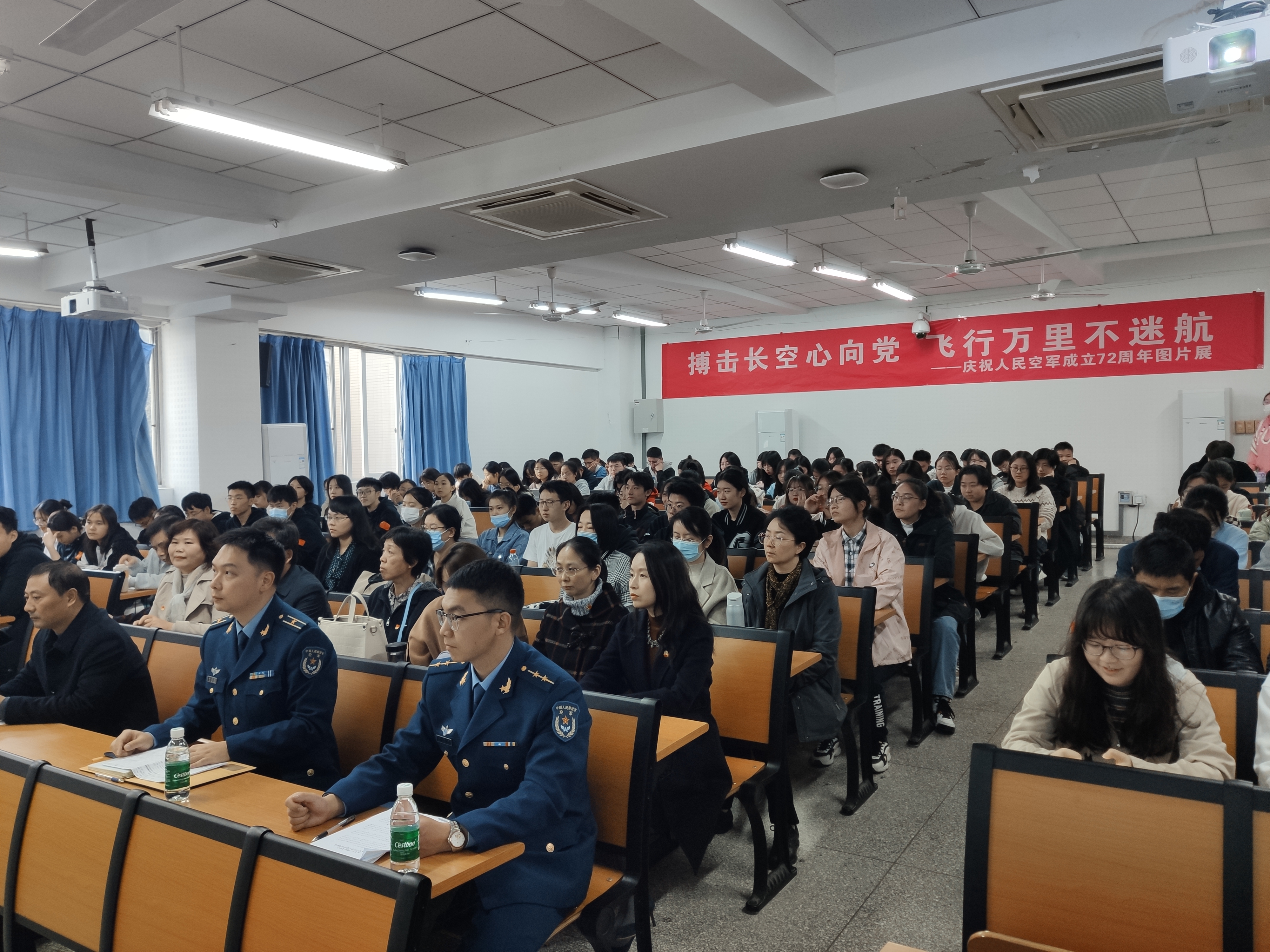 为了积极推进我校党史学习教育,培养广大师生的爱国拥军情怀,11月17日下午,我校党委宣传部、保卫处、mg冰球突破试玩主办的《搏击长空心向党,飞行万里不迷航》—庆祝人民空军成立72周年专题报告会和图片展在卫岗校区举行。来自党委宣传部、校保卫处、mg冰球突破试玩的160余名师生与驻宁空军某部官兵一同参加了活动,活动由mg冰球突破试玩公外教师第二支部承办。