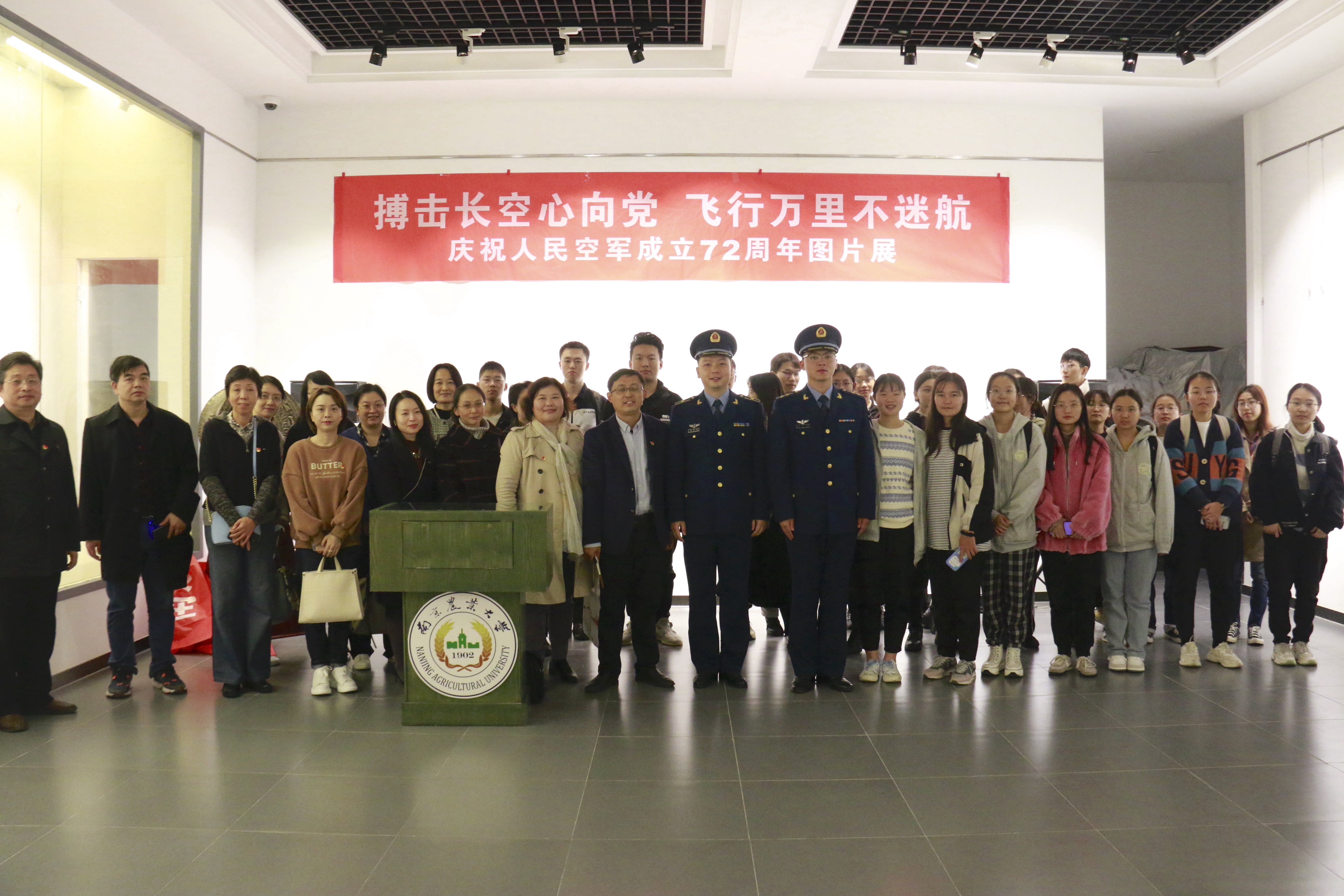 在中华农业文明博物馆展出的《搏击长空心向党,飞行万里不迷航》—庆祝人民空军成立72周年专题图片展上,姚副连长围绕“从无到有”、“航校成立”、“遭遇轰炸”、“开国大典”、“抗美援朝”、“国产首飞”、“参加核试”、“众鹰列阵”等9个板块对人民空军的发展历程做了详细的解读,进一步加深了我校师生对人民空军的了解,更增强了全体师生的国防意识,对党在新时代的强军目标、建设世界一流军队的要求,有了更加具体而深入的体会,对坚决维护党和国家建设大局,坚决维护国家主权、安全、发展利益,中国梦强军梦的实现信心倍增。