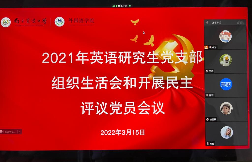 为深入学习贯彻习近平新时代中国特色社会主义思想,学习贯彻党的十九大和十九届六中全会精神,提升党支部的凝聚力,根据学校统一部署,3月15日下午,冰球官网英语研究生党支部举行了线上2021年度组织生活会,并开展了民主评议党员活动。院党委副书记韩立新和英语研究生党支部全体党员一同参加了会议,会议由党支部书记杨洁主持。
