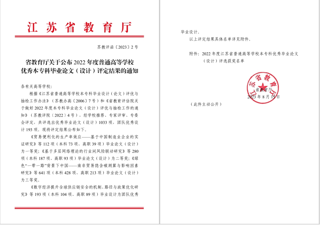 江苏省教育厅近日发布了2022年度江苏省普通高校优秀本专科毕业论文(设计)的评定结果,我校共获优秀毕业论文(设计)19项,其中冰球官网获得优秀毕业论文(设计)三等奖1项和优秀毕业设计(论文)团队奖1项。