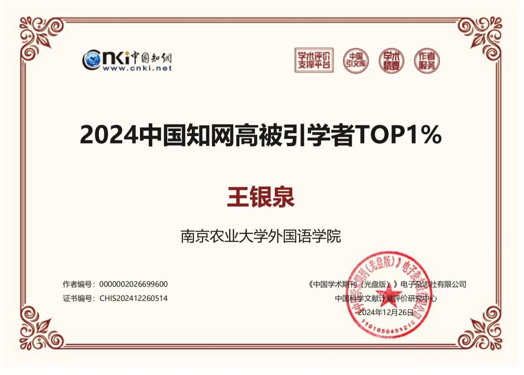 近日,中国知网遴选并公布了“2024中国知网高被引学者”名单,mg冰球突破试玩王银泉教授入选“2024中国知网高被引学者TOP1%”。