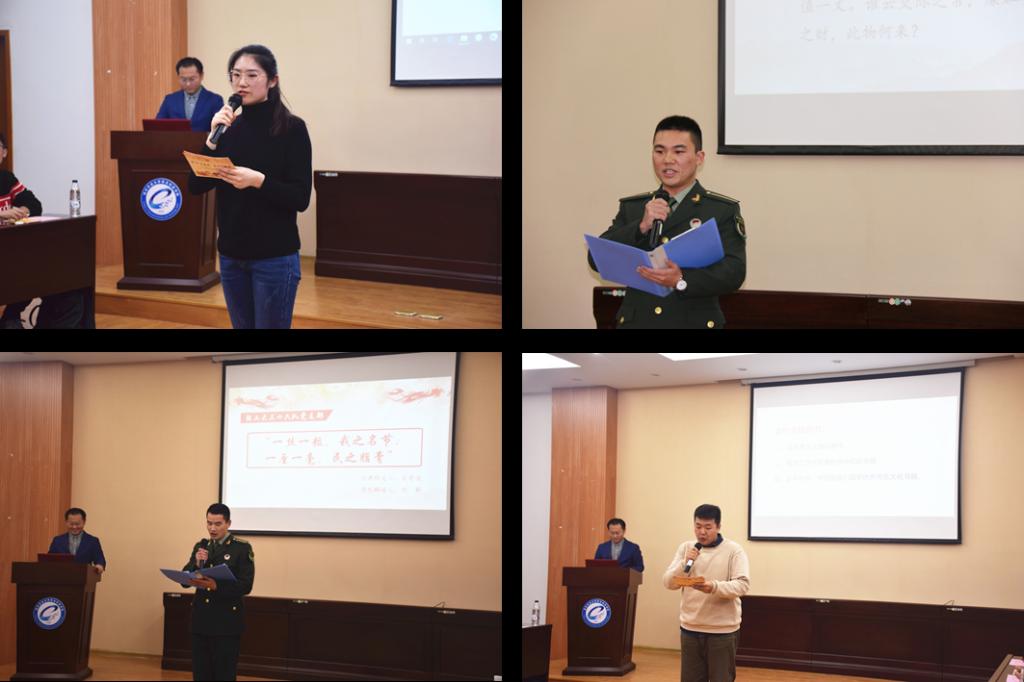 冰球官网和陆工大四个学生支部分别围绕“民生”、“家风”“劝学”“廉政”展开汇报。英语本科生党支部的刘晨韵和徐婷婷同志通过对“一枝一叶总关情”的经典释义和思想解读全面阐释了习近平总书记以人民为中心的发展思想。日语本科生党支部的陆艳和肖书彤同志以石碏谏卫庄公的故事诠释了“爱子,教之以义方”内涵,并强调了家庭教育的重要性。英语和日语研究生党支部的刘维杉和徐畅同志深挖“独学而无友,则孤陋而寡闻”,提出了“与其联机游戏,不如集思广益”的倡议,并深刻解读了当代青年应该“读什么样的书”。陆军工程大学三十六队党支部肖有效和刘薪同志借“一丝一粒,我之名节;一厘一毫,民之脂膏”原典作者张伯行的事迹,铿锵有力地阐释了廉政的内涵,并提出党员同志要脚踏实地,保持谦虚谨慎的心态。