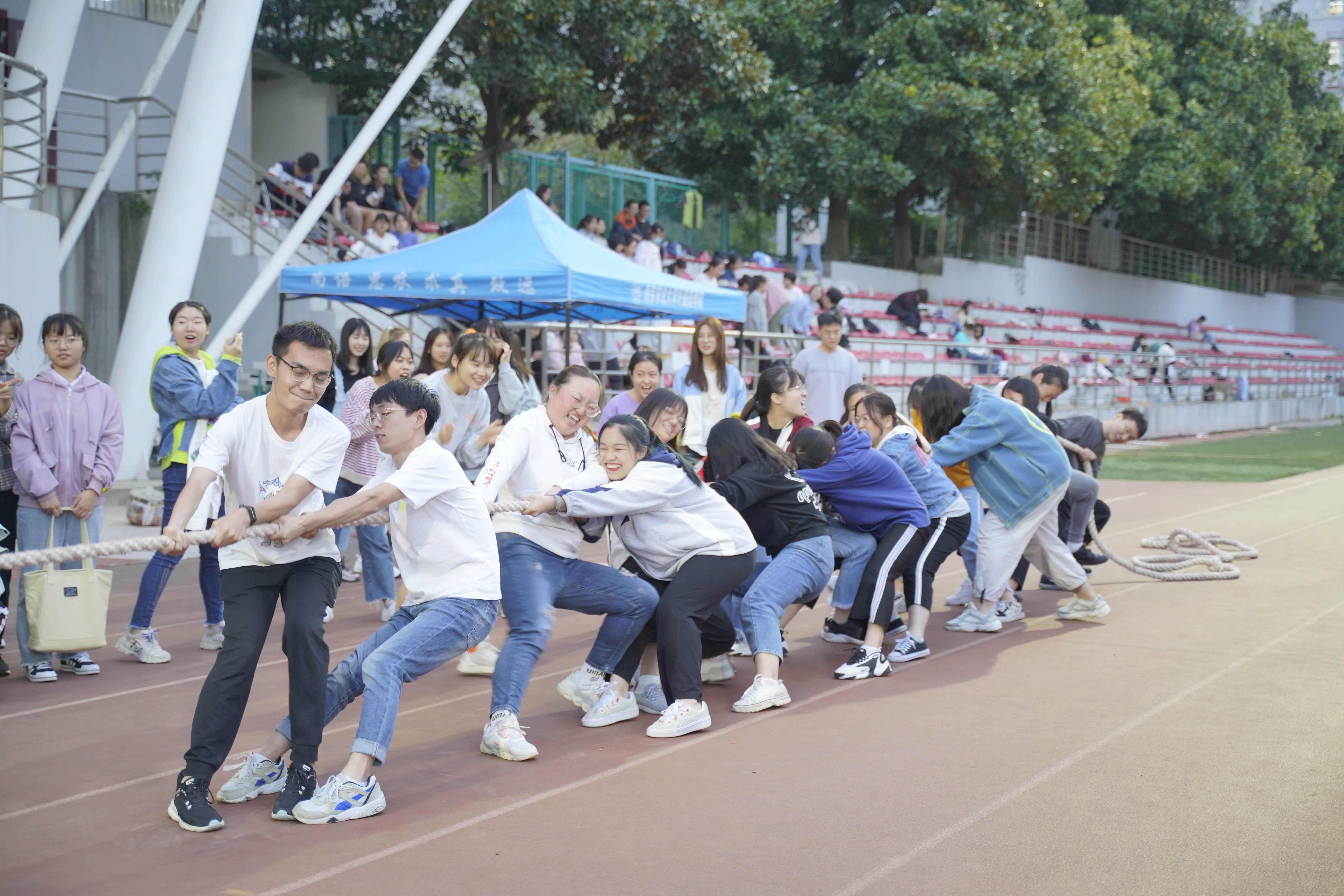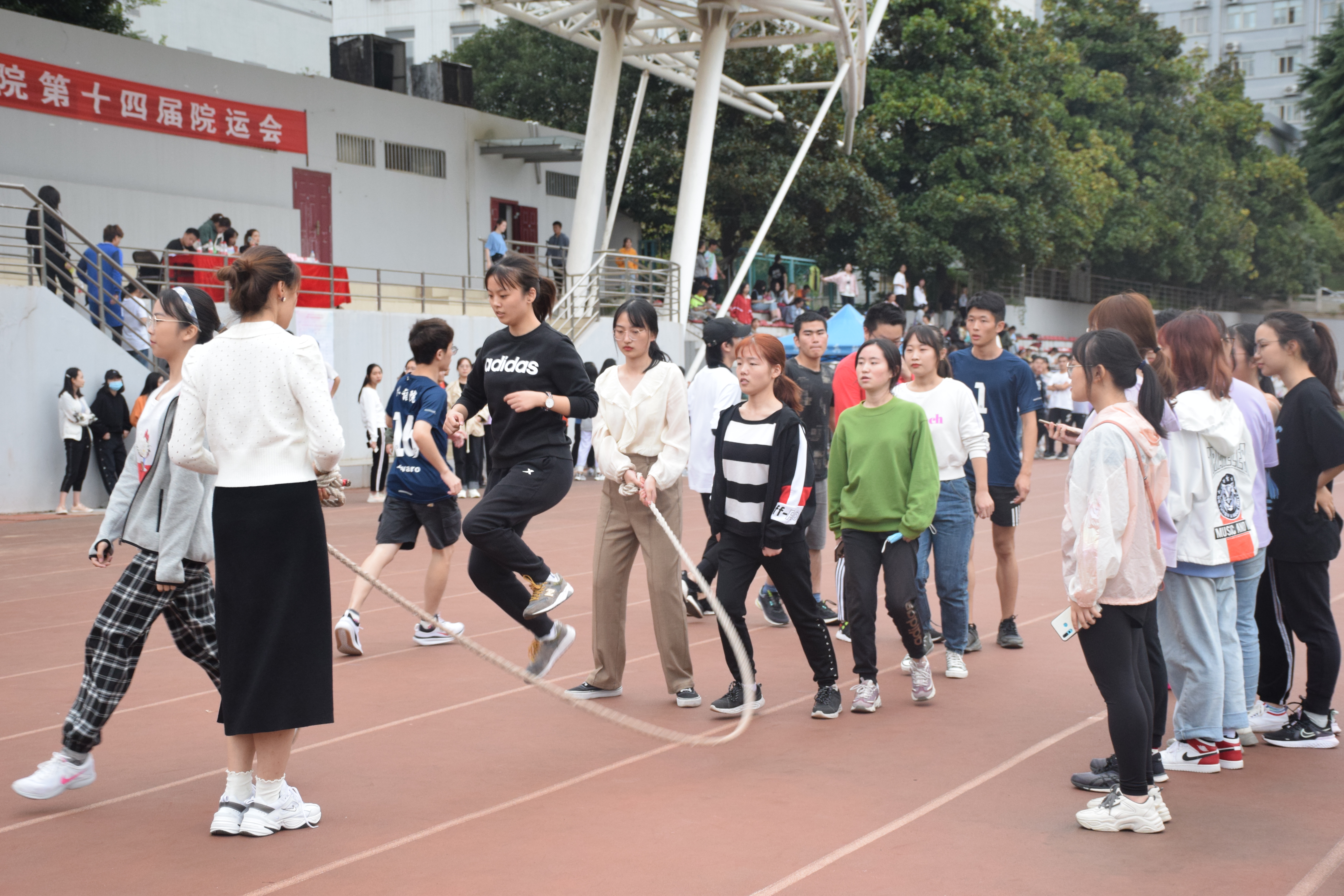 本届运动会分为个人项目、集体项目两个大类,其中个人项目包括田赛和径赛,集体项目包括男女混合4×100米接力、8×50米迎面接力、跳大绳和拔河。运动会上,运动员们充分发扬“奥林匹克”精神,尊重对手,自信拼搏;裁判员组织有序,严谨公正;各班组织学生为运动员呐喊喝彩,提供服务。拔河比赛是最能展现班级凝聚力的环节,全体同学目标一致,团结用力,场上场下参与感爆棚。