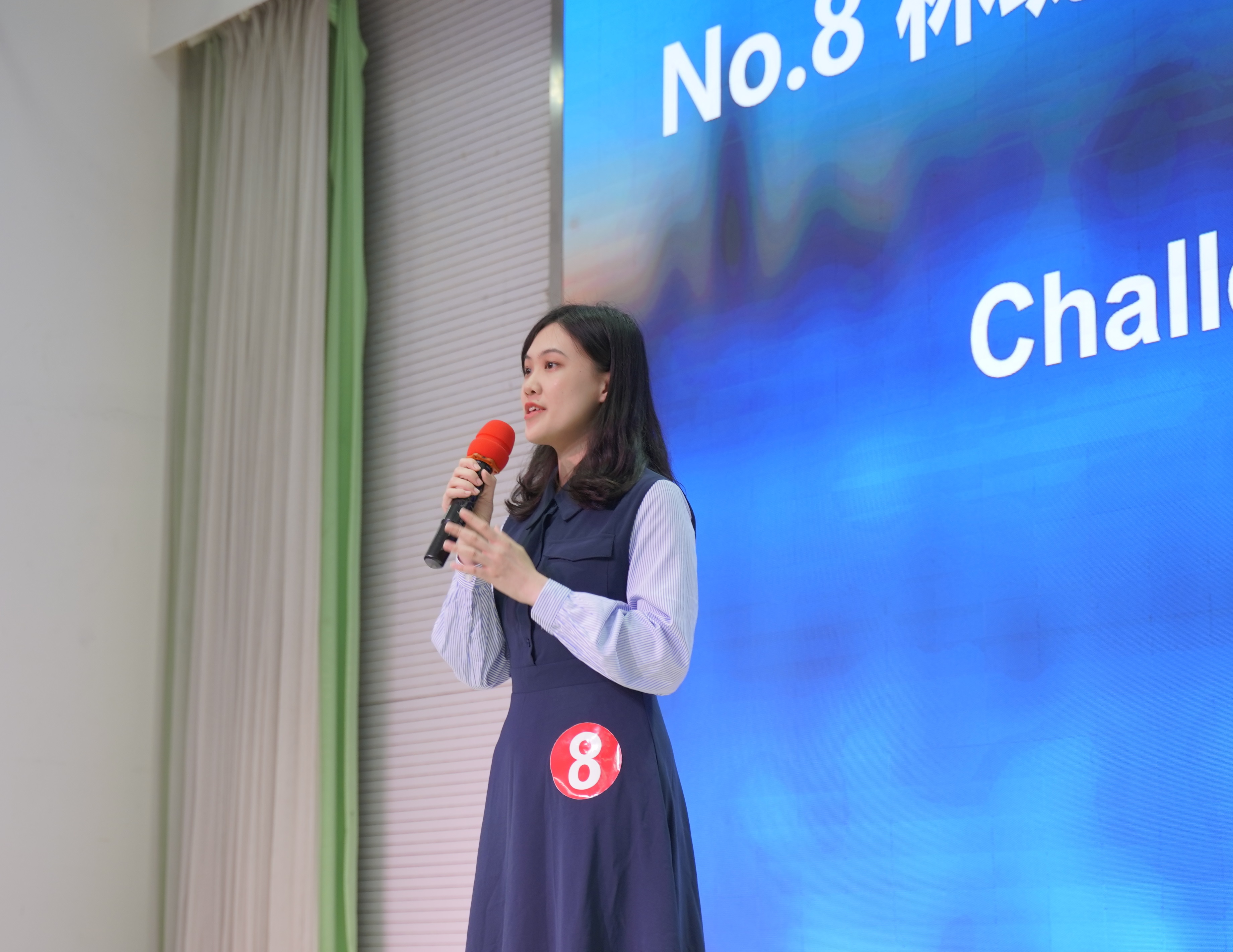 决赛分为定题演讲和即兴演讲两轮。第一轮定题演讲的主题为Challenge to all,每位选手演讲完毕后由评委老师就演讲内容进行提问并打分,排名前五名的选手进入第二轮即兴演讲。定题演讲结束后,霍雨佳从语音、姿态、眼神、临场表现等方面进行点评,并针对选手的表现提出建议。最终,刘颖希、周慧洋、赵瑜涵、陶冶、王圆五位同学进入决赛。